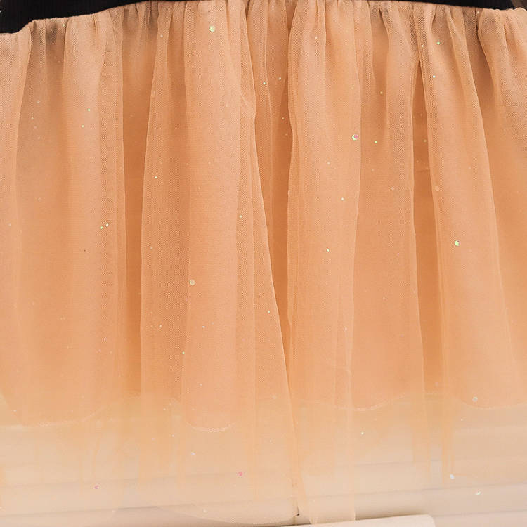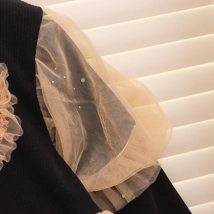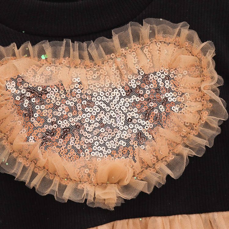 Dress your little princess in elegance with this stunning black and golden tulle party dress. Designed with puffed net sleeves and a delicate layered skirt, it features a shimmering heart embellishment at the center that adds charm to the outfit. Perfect for birthdays, festive celebrations, or special occasions, this dress combines comfort with timeless style.